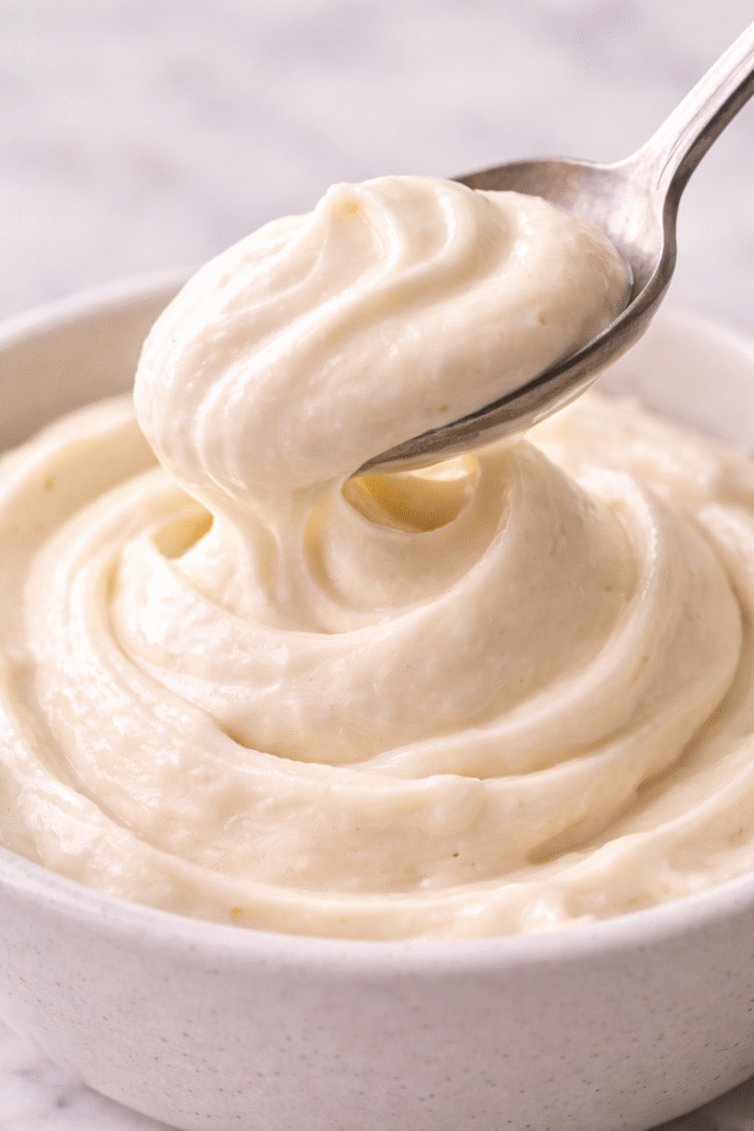 There should be no visible curds. Scrape down the sides as needed to fully incorporate everything.