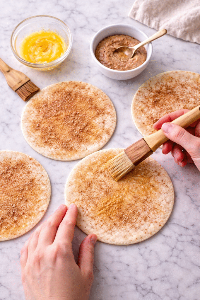 Lay the tortillas flat and brush both sides generously with melted butter or coconut oil. Sprinkle the cinnamon-sugar mixture evenly over both sides, pressing gently so it sticks.