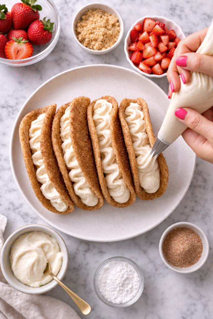 For a different texture, freeze assembled tacos for about 30 minutes for a chilled, cheesecake-style dessert.