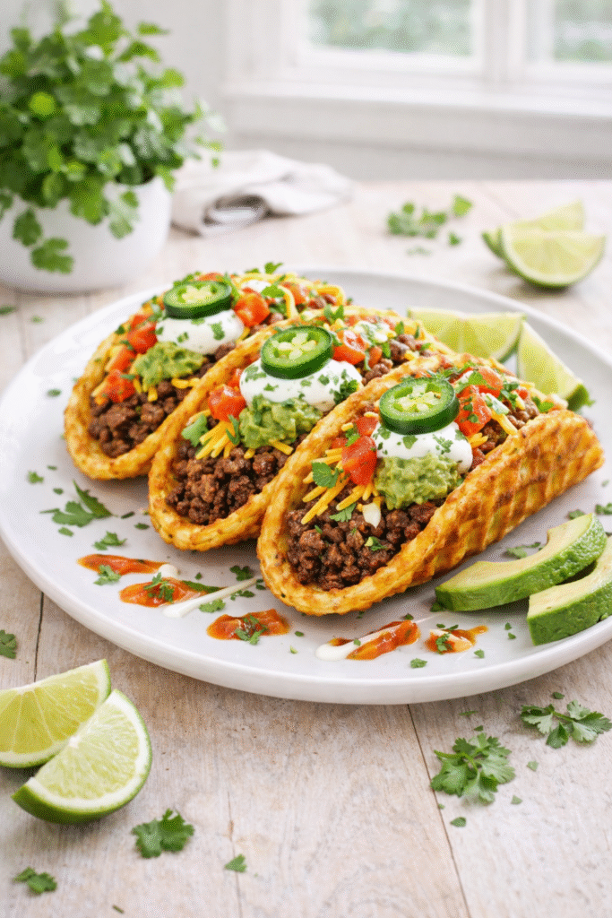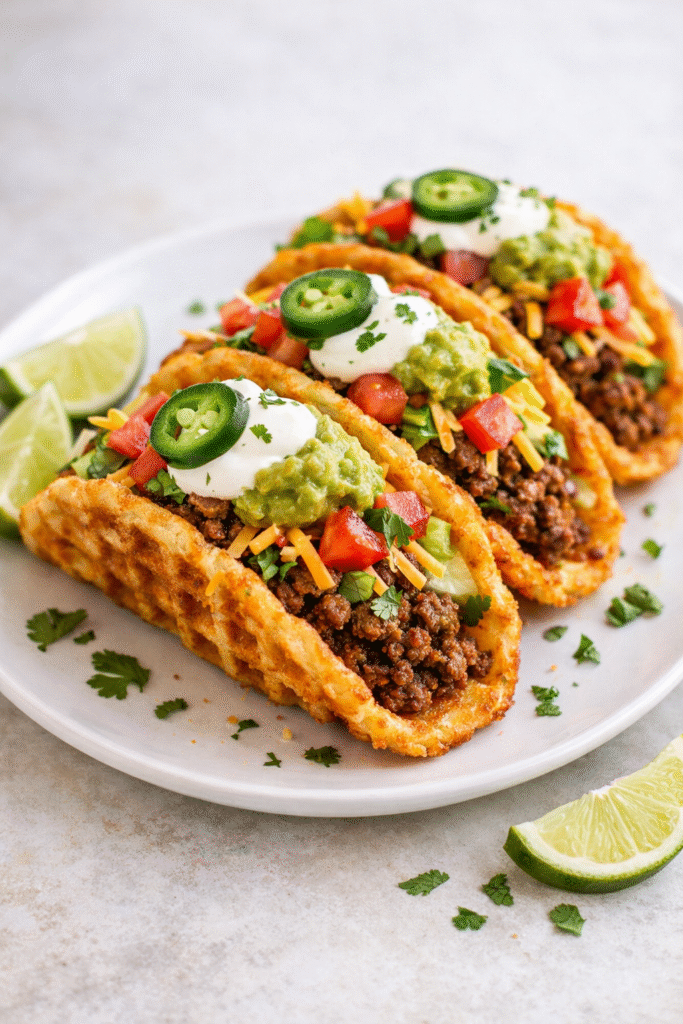 Get ready for the ultimate solution that will make you the hero of Taco Tuesday 🌮: our Crispy Keto Chaffle Taco Bar. This isn’t just a recipe; it’s a full-blown, interactive culinary event. We’re taking the internet-famous chaffle—a miraculous blend of cheese and egg that transforms into a bread-like wonder—and shaping it into the most perfect, sturdy, and deliciously crispy taco shell you’ve ever tasted. The best part? These shells are not a fragile, falling-apart compromise; they are robust vessels ready to hold all the seasoned ground beef, fresh salsa, creamy guacamole, and tangy sour cream your heart desires. This Crispy Keto Chaffle Taco Bar is designed to bring the joy, fun, and flavor back to your table.