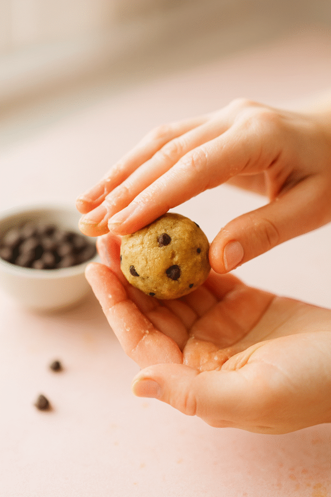 Mix just enough to evenly distribute the chocolate without breaking the chips. Now grab a 1-tablespoon cookie scoop (your secret weapon for perfectly uniform, Instagram-worthy bites!). Scoop the dough and roll each portion firmly between your palms to form smooth, tight balls.