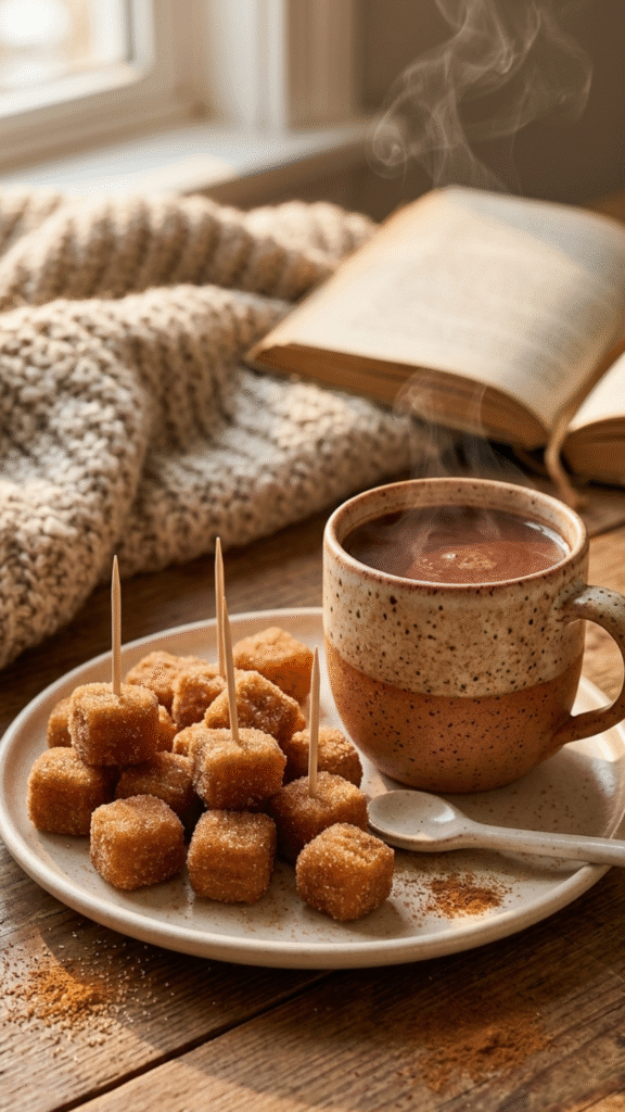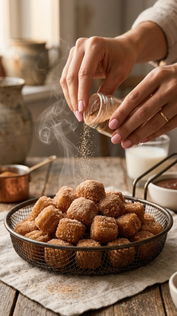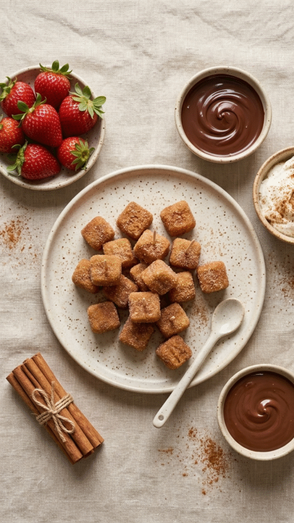Imagine this: golden, crispy little bite-sized churro pieces, rolled in cinnamon “sugar,” with a crunchy outside and a soft, almost custard-like center that melts in your mouth. Every bite gives you that classic churro energy—warm spice, sweet coating, and that satisfying crunch—just without the deep fryer or sugar crash.