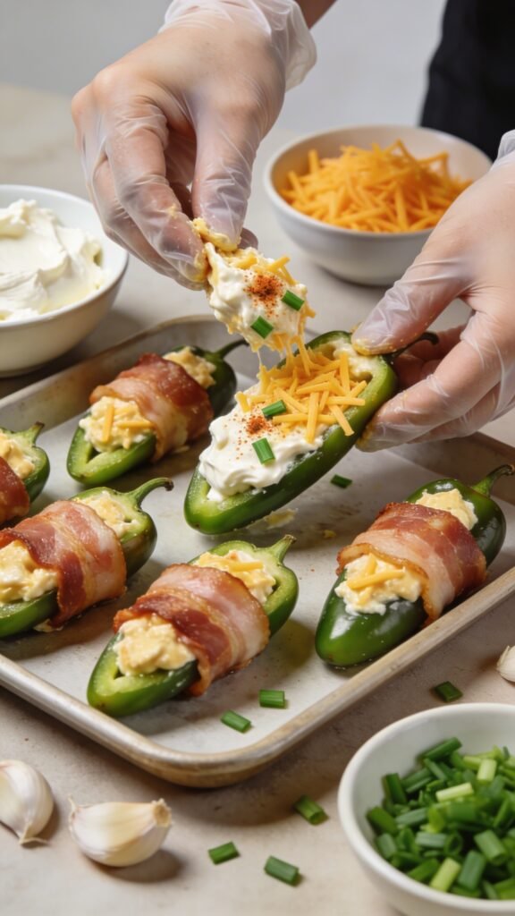 Take your 1 lb of bacon and wrap each filled jalapeño half like the masterpiece it is. If your peppers are smaller, you can cut the bacon slices in half. Start at one end and spiral around, tucking or overlapping slightly to cover the filling. Place each popper seam-side down on your prepared baking sheet or rack. If your bacon’s being stubborn, secure it with a toothpick. Leave space between each one so they crisp evenly — they need their personal space, okay? 😌