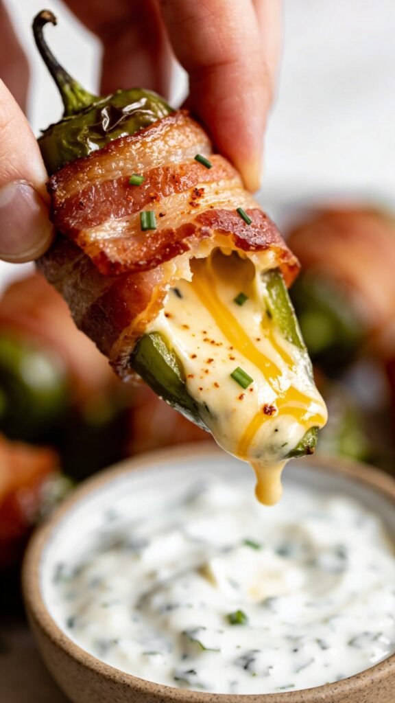 Then comes the filling — a mix of cream cheese and sharp cheddar that melts into creamy, tangy, savory perfection. The combo balances out the spice and gives every bite that comforting, velvety texture we all crave. And when you wrap it all up in bacon? Game over. As it bakes, the bacon’s fat slowly renders, basting each popper in smoky, salty goodness 🥓. It crisps up beautifully while keeping the inside rich and smooth — basically, the dream team of textures and flavors.