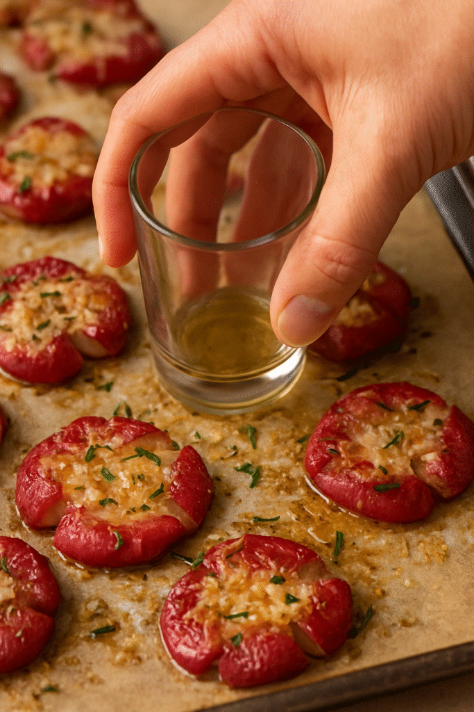 - Smash & Season Generously: Preheat your oven to 425°F (220°C). Line a baking sheet with parchment paper for easy cleanup. Carefully transfer the slightly cooled radishes to the prepared baking sheet, giving them plenty of space so they aren’t touching. Now for the fun part! Using the flat bottom of a heavy glass, a mason jar, or the bottom of a measuring cup, gently but firmly press down on each radish until it flattens and “smashes” to about 1/2-inch thickness. Don’t worry if they crack a little—that just creates more edges for crisping! In a small bowl, whisk together the 2 tbsp olive oil, 2 cloves of minced garlic, 1 tsp rosemary, 1/2 tsp salt, and 1/4 tsp pepper. Use a pastry brush to generously coat the top of each smashed radish with the seasoned oil. Make sure every nook and cranny gets some love!